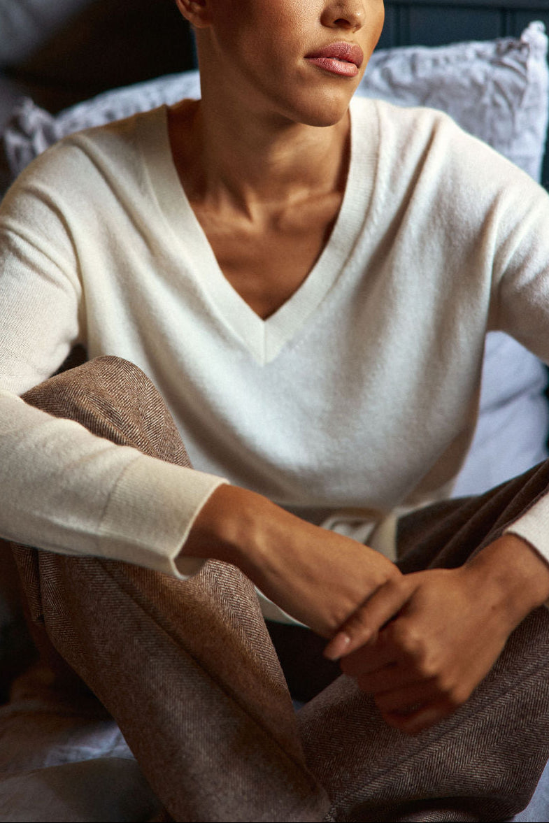 Melya. le pull en cachemire écru à col V et coupe ample. une pièce douce et moderne qui allie fluidité. confort et élégance casual en toute simplicité.