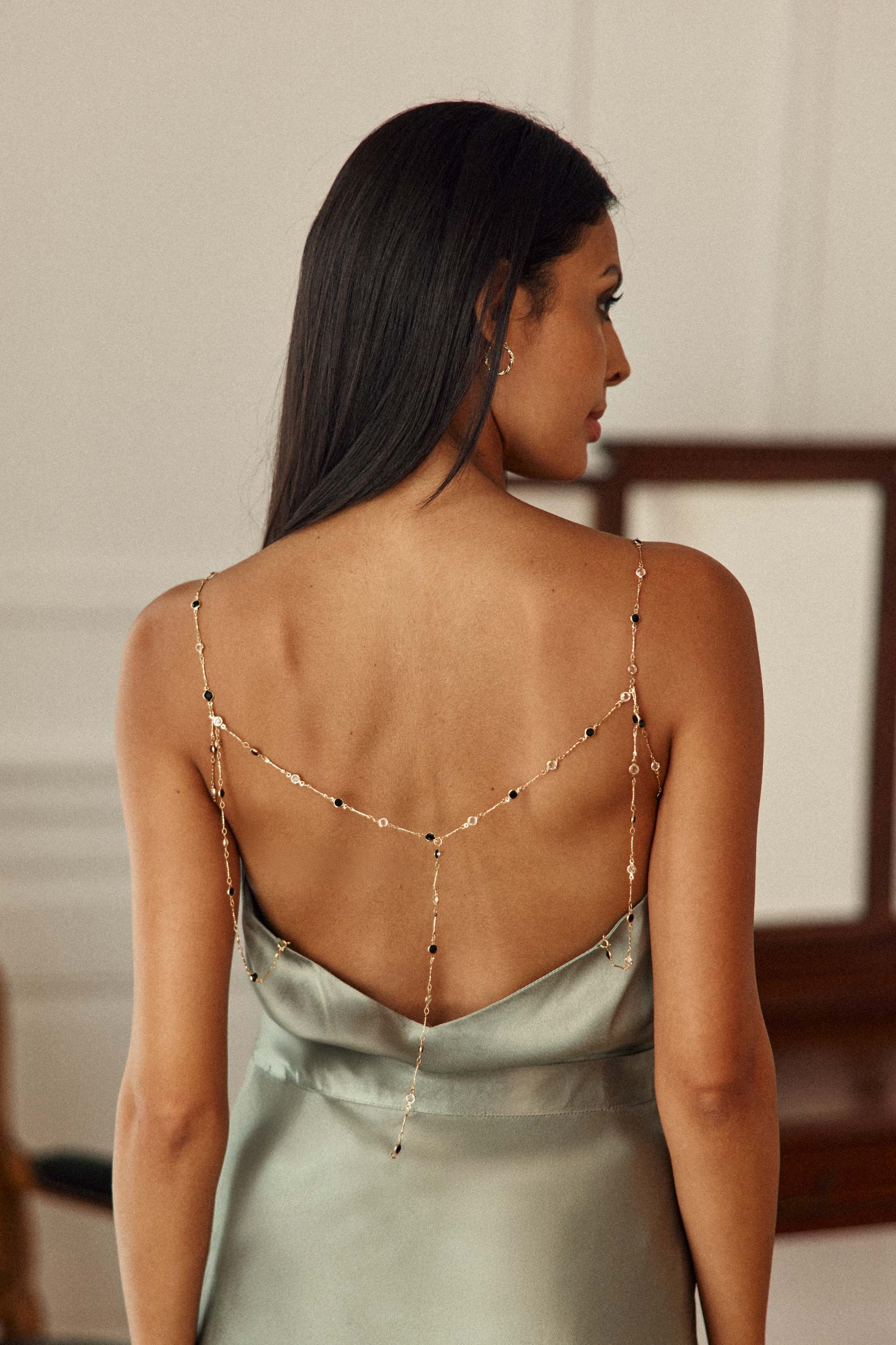 Dara. un caraco vert amande orné de délicates chaînes dorées et d'un dos profond. une pièce lumineuse à porter seule ou sous une veste.