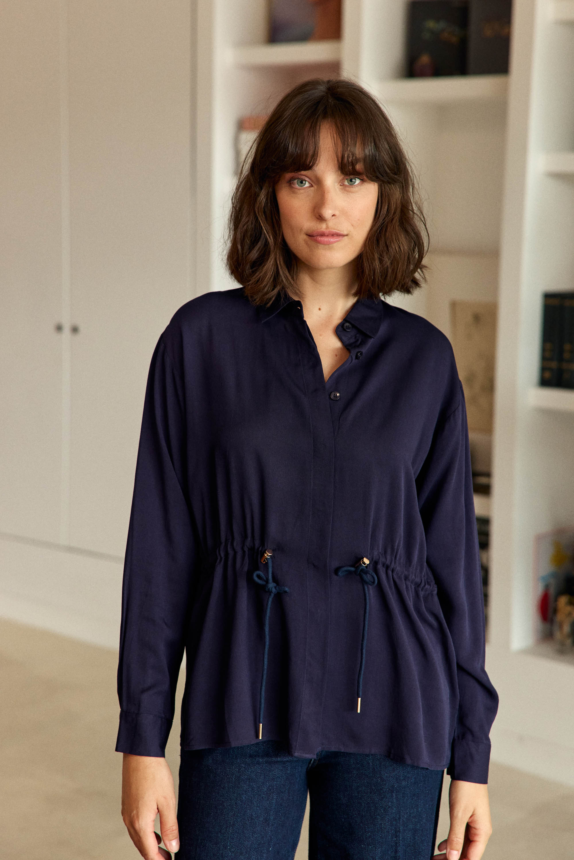 Claris. le chemisier marine fluide à coupe droite. avec col chemise. manches longues et liens de serrage à la taille.