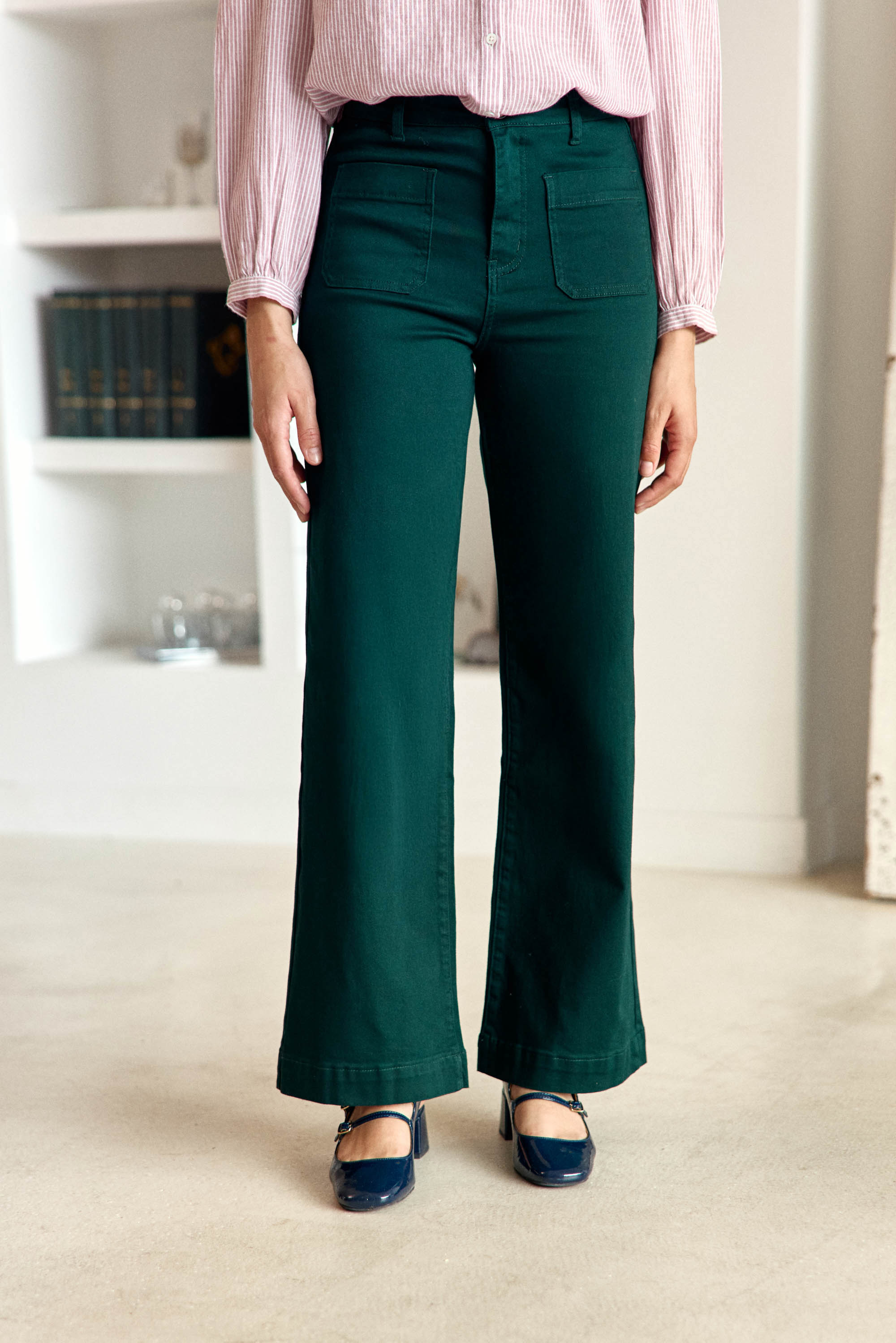 Atlantyt. le jean vert anglais à coupe évasée. avec taille haute. fermeture zippée et poches plaquées devant et au dos.