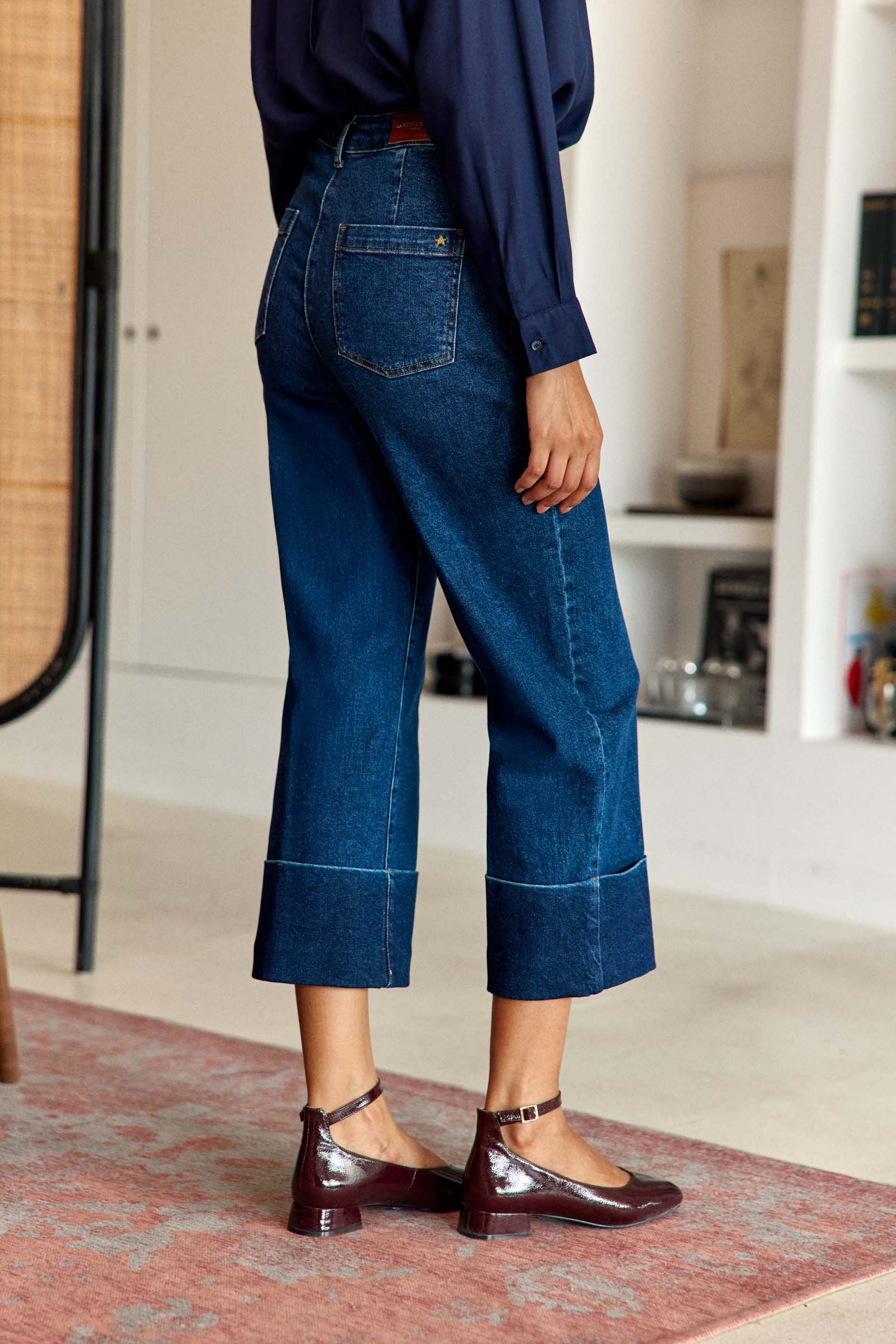 Parly. le jean droit et large en coton. élégant et confortable avec poches italiennes. poches dos et revers en bas de jambe.