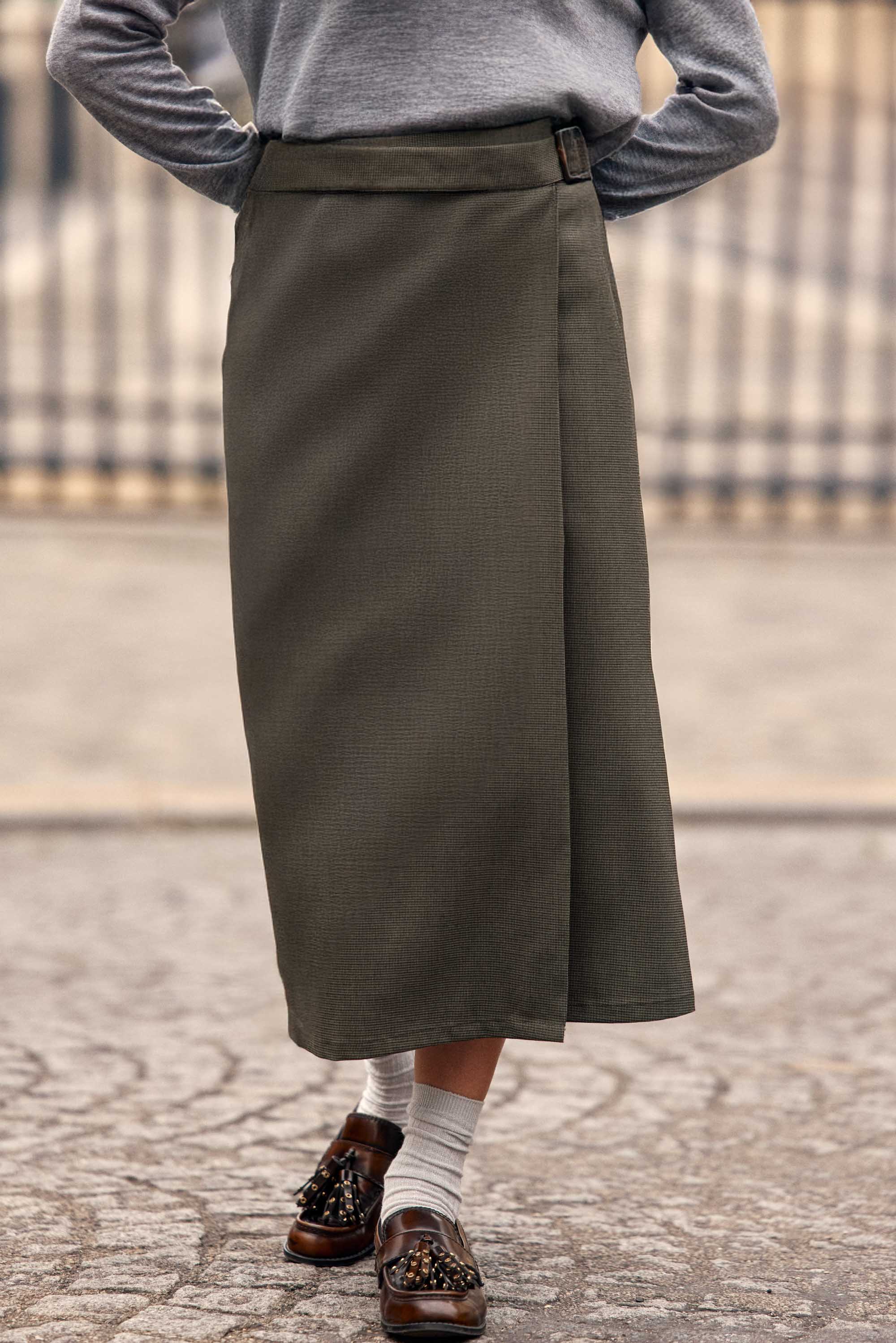Jaden. la jupe portefeuille kaki longueur midi à coupe droite. soulignée d'un motif pied-de-puce et d'une taille haute avec ceinture à boucle.