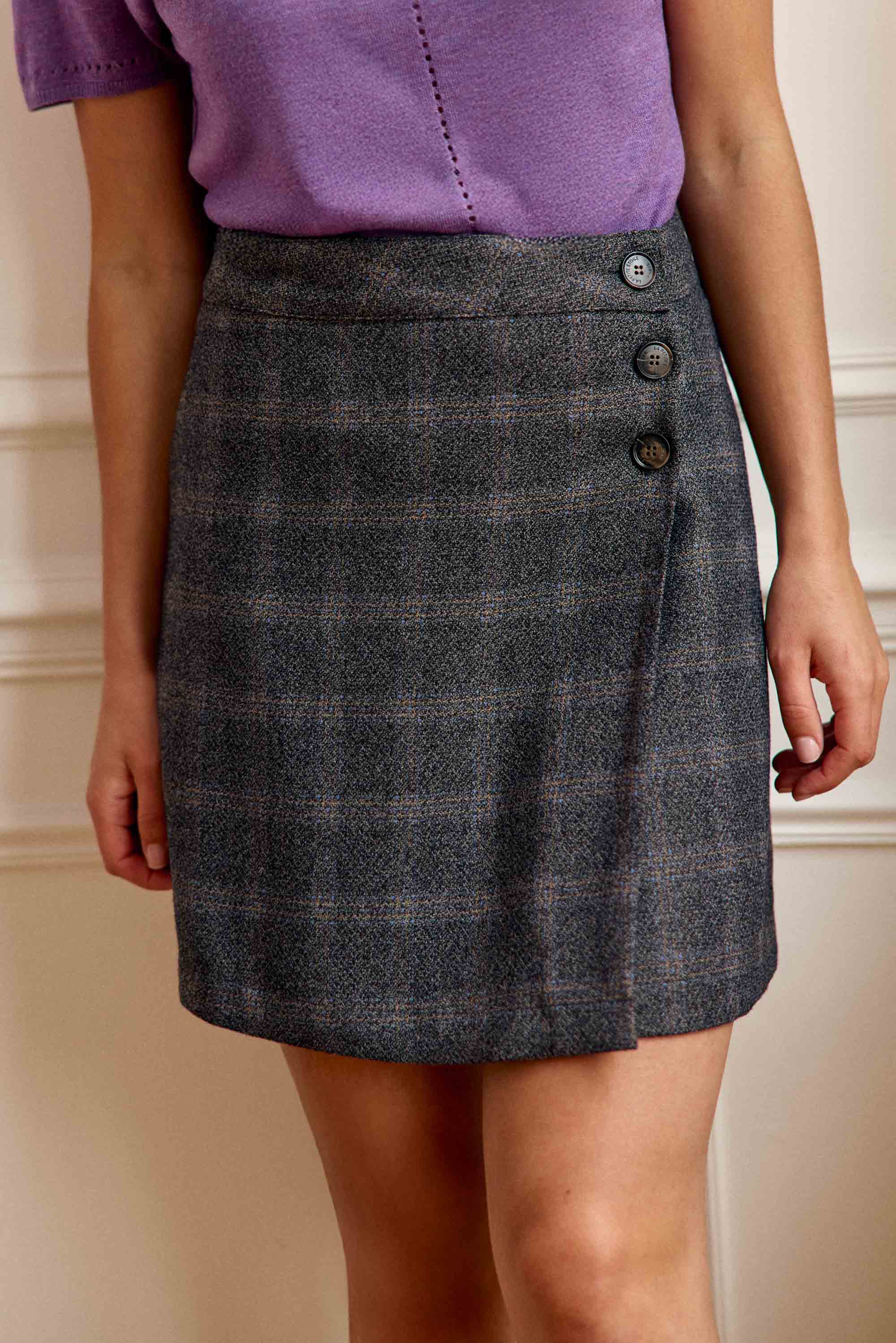Jone. la jupe courte gris et bleu coupe portefeuille. confectionnée en tweed à carreaux avec taille haute et boutonnage croisé.