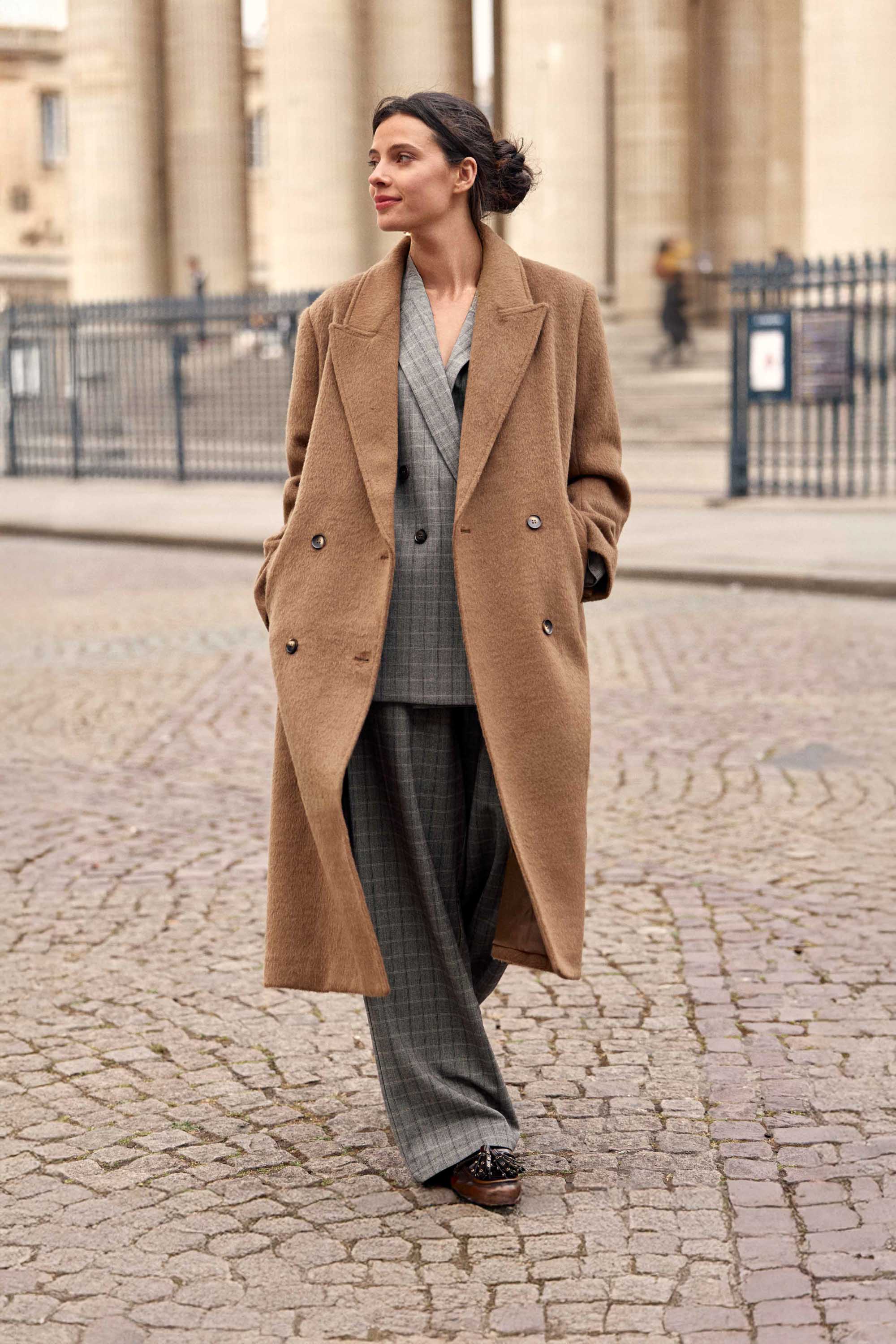 Nour. le manteau long camel à coupe droite. avec col tailleur. double boutonnage et poches raglan.