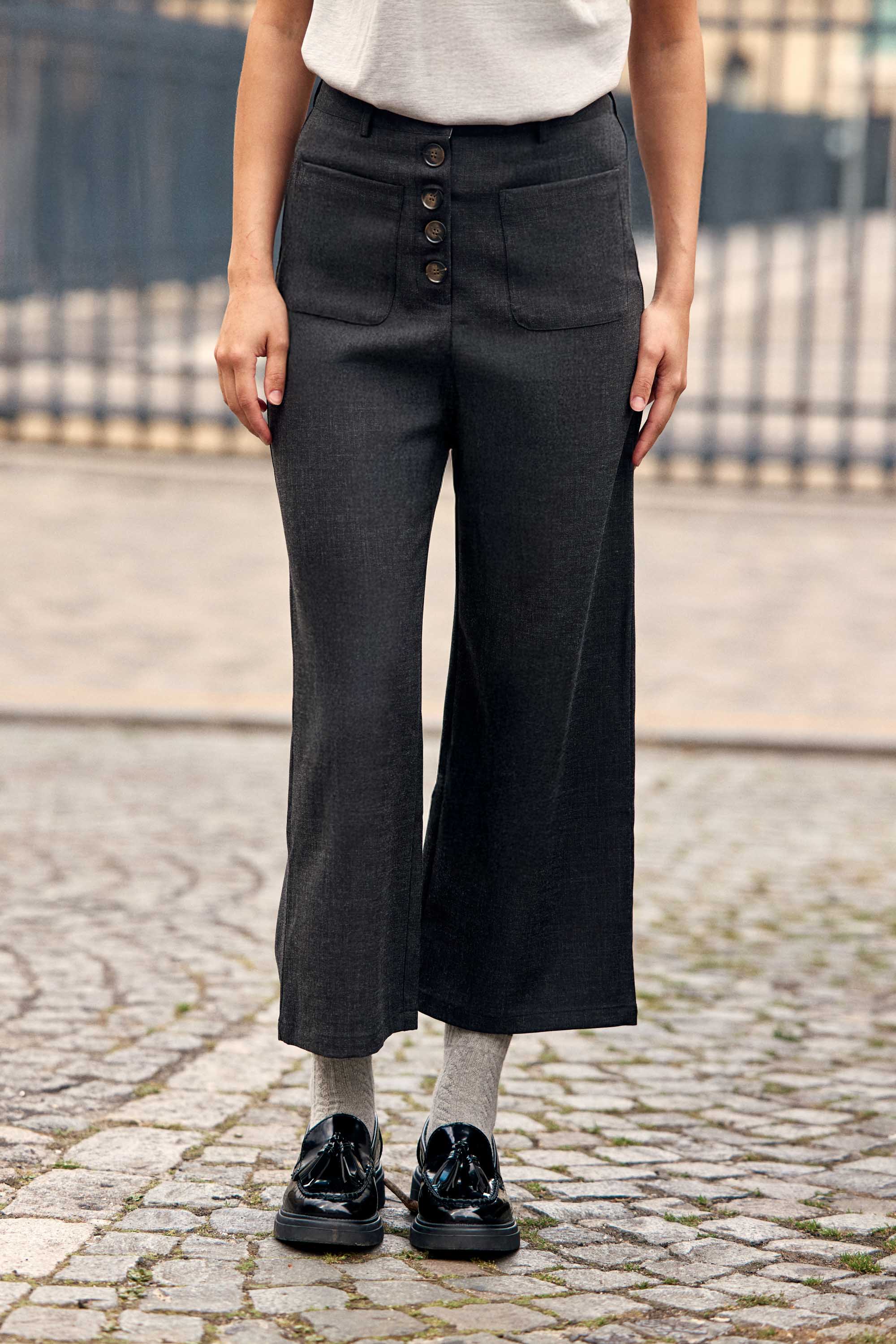 Atlana. un pantalon 7/8ème anthracite à coupe large. avec taille haute. poches plaquées et fermeture boutonnée devant.