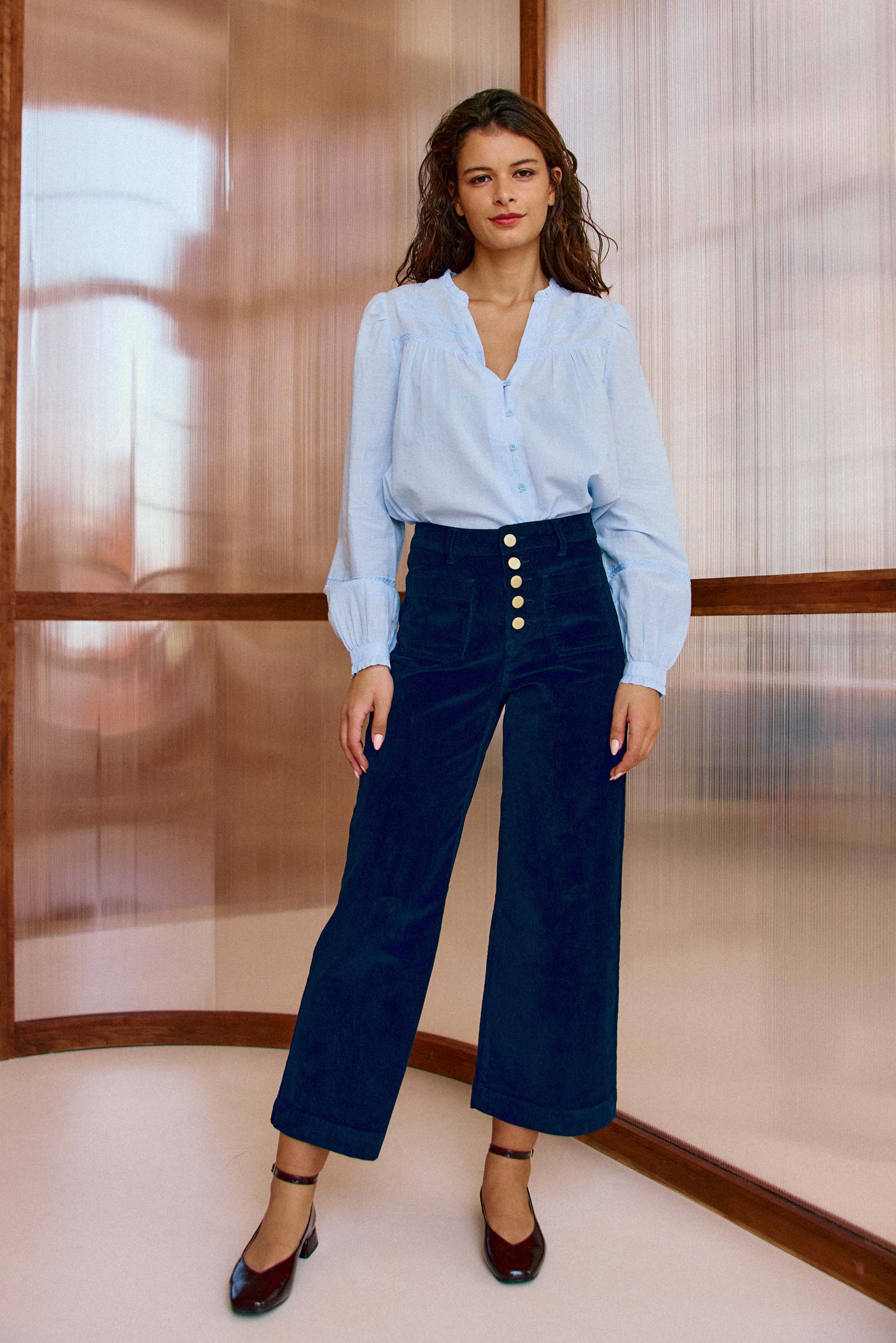 Atlanta. un pantalon en velours marine qui allonge la silhouette et apporte une touche rétro élégante à vos looks.