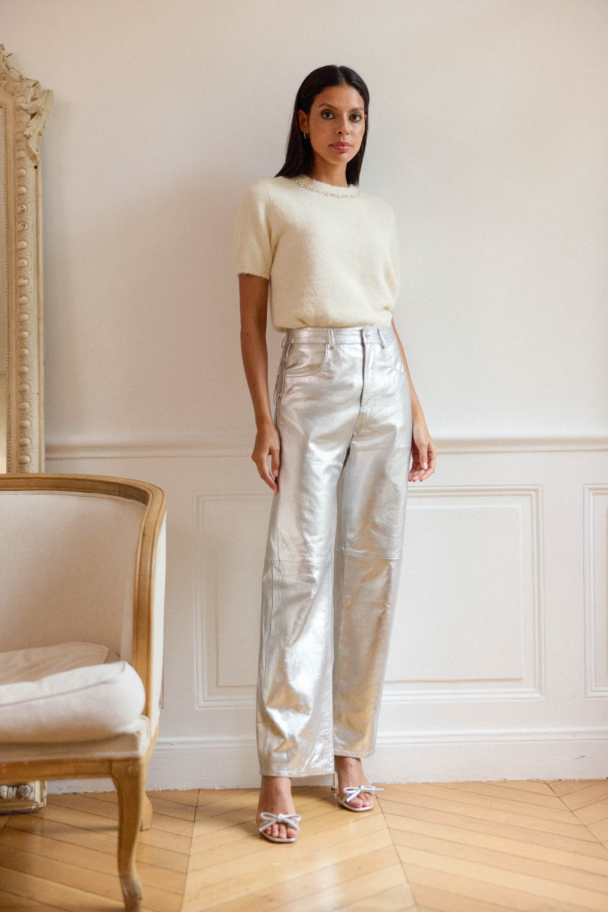 Zephyr. un pantalon droit en cuir argenté. taille haute avec poches et fermeture zippée à la ceinture. pour un look audacieux et tendance.