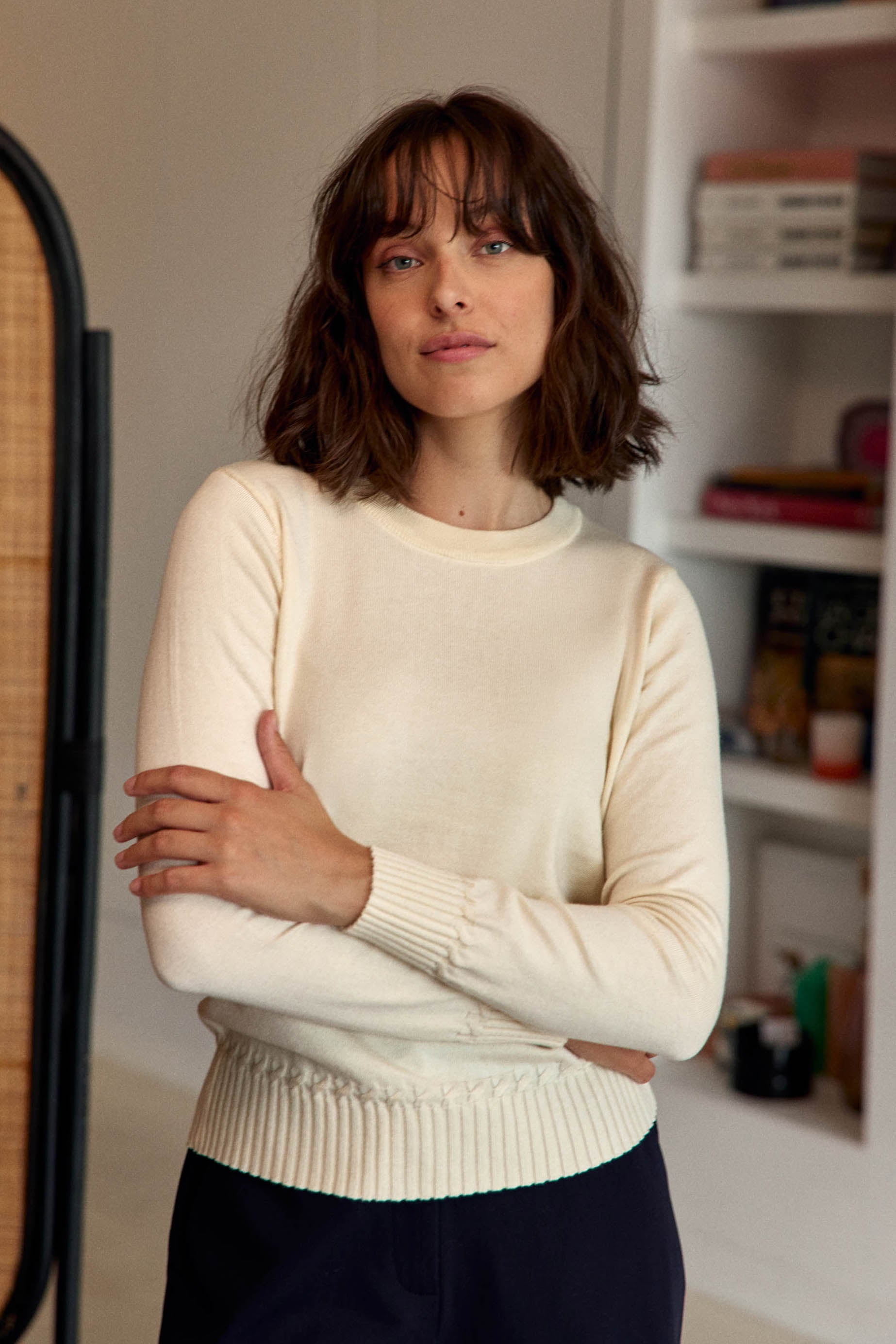 Maha. le pull écru blousant en maille douce à coupe confortable. avec encolure ronde et manches longues.