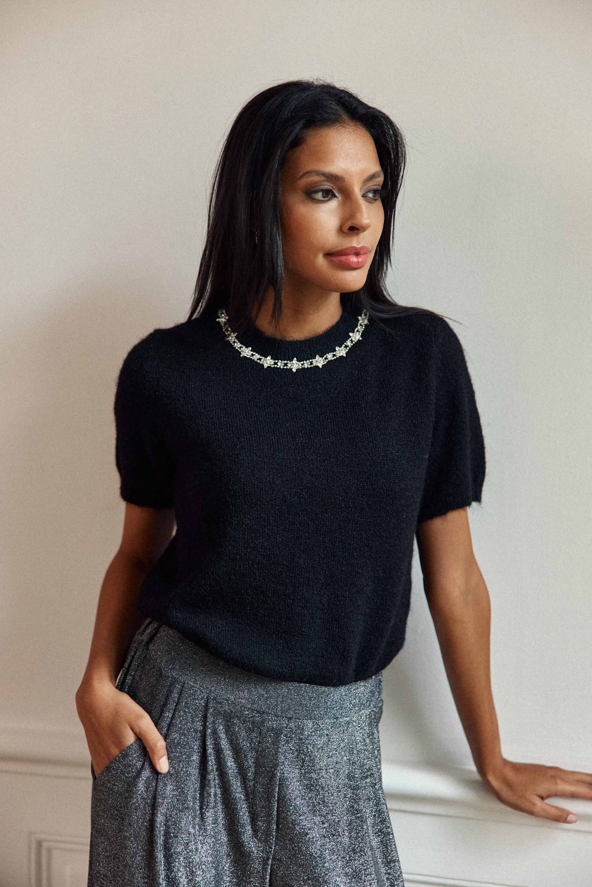 Matis. un top en maille noir orné de strass à l'encolure. manches courtes et col rond. avec goutte boutonnée au dos pour une note féminine.