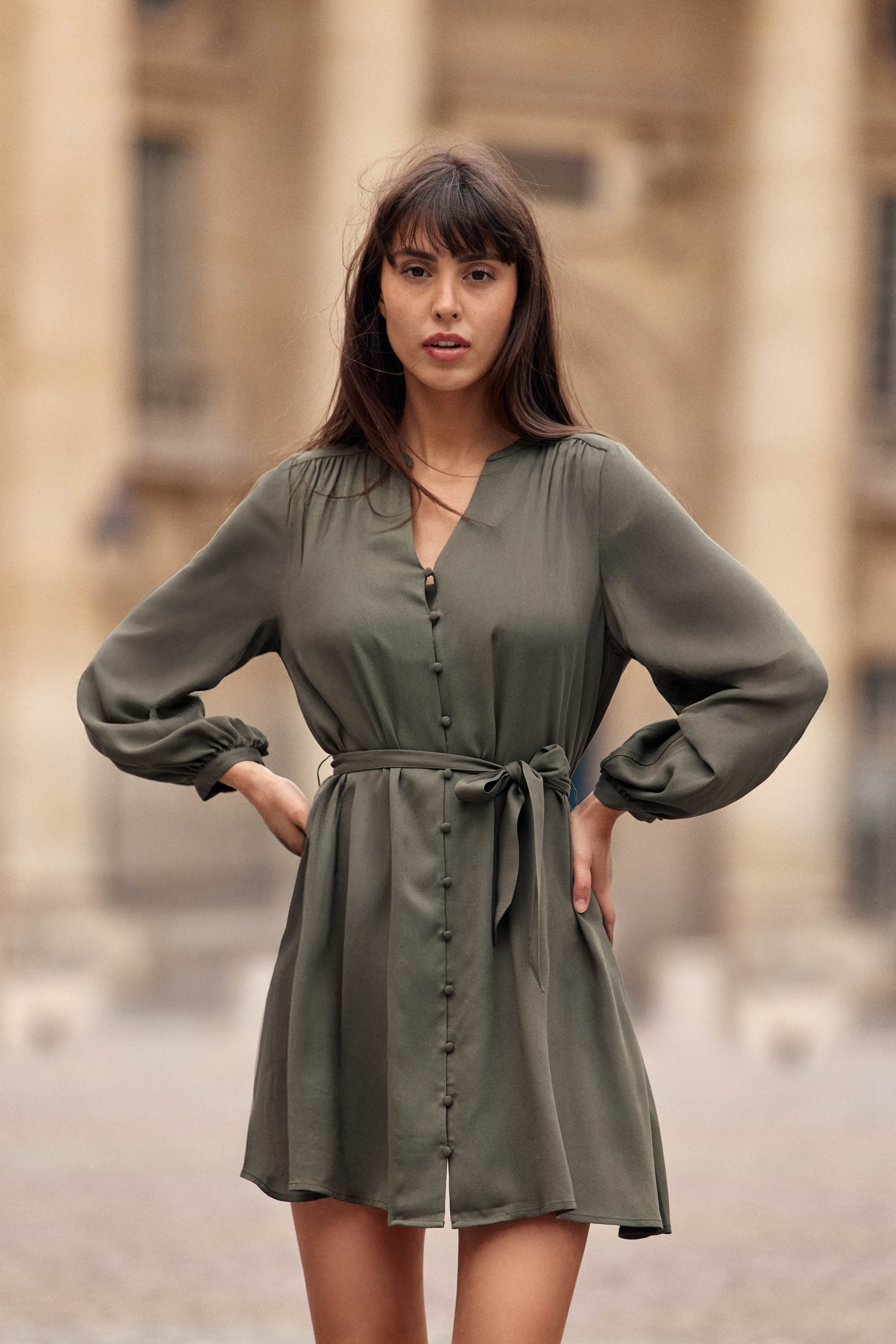 Ruyan. la robe courte fluide kaki à coupe évasée. avec encolure en V. manches longues à fentes boutonnées et boutonnage devant.