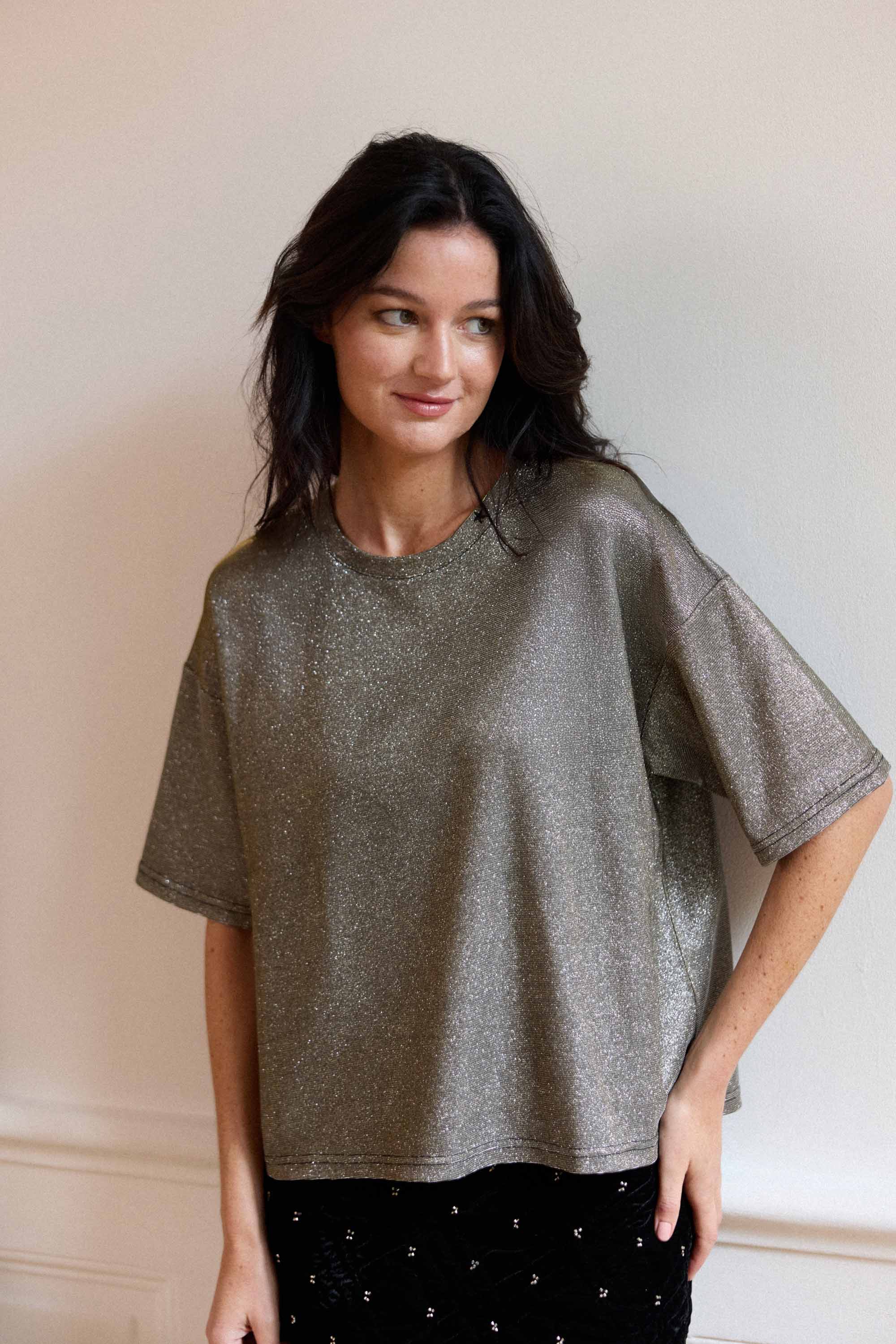 Tais. un t-shirt oversize en maille lurexée argentée. avec col rond. manches courtes et broderie étoile dorée à l'encolure pour une touche lumineuse.