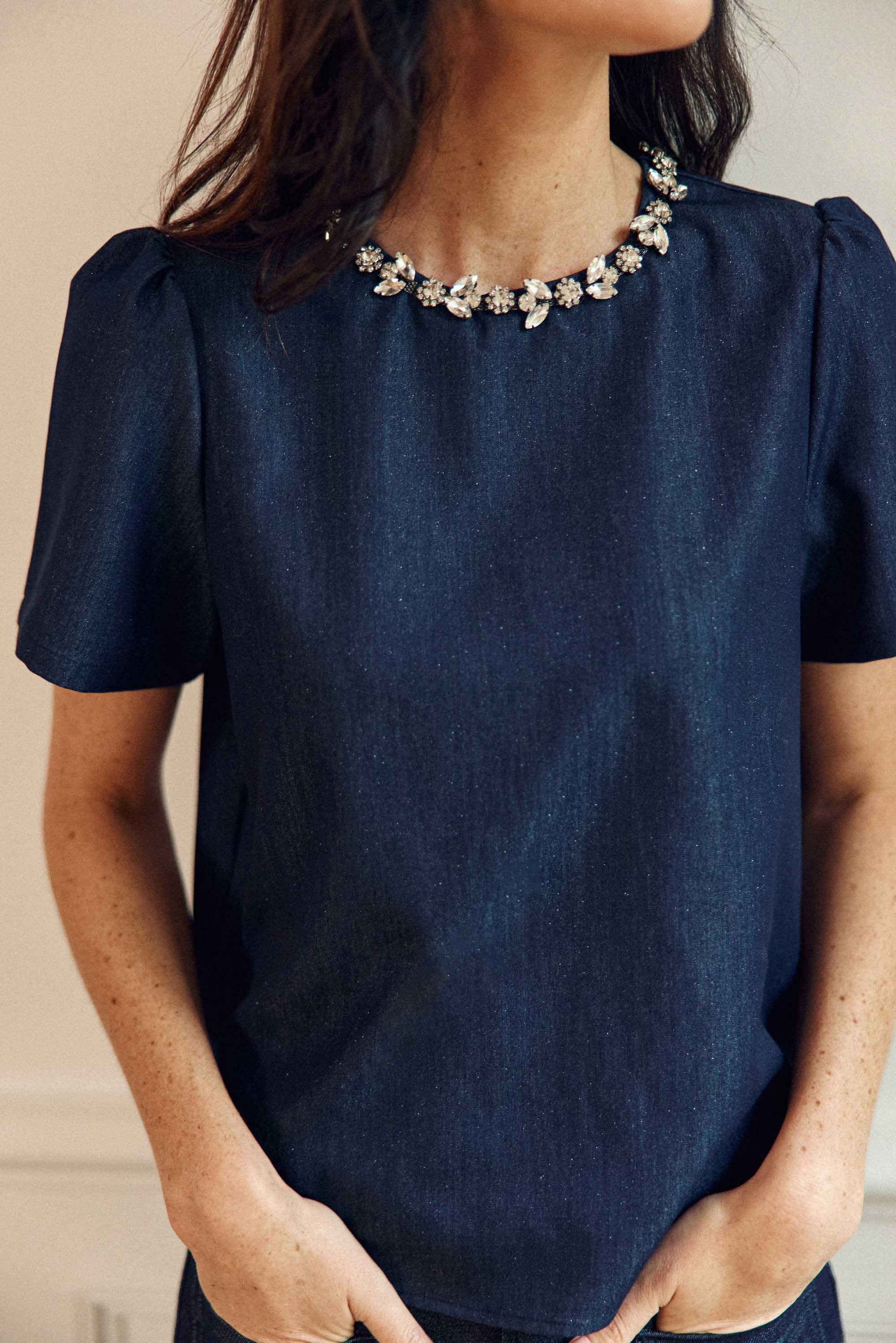 Tylee. un top boxy effet denim lurexé décoré de strass à l'encolure. avec manches courtes et goutte boutonnée au dos. pour une note brillante et moderne.