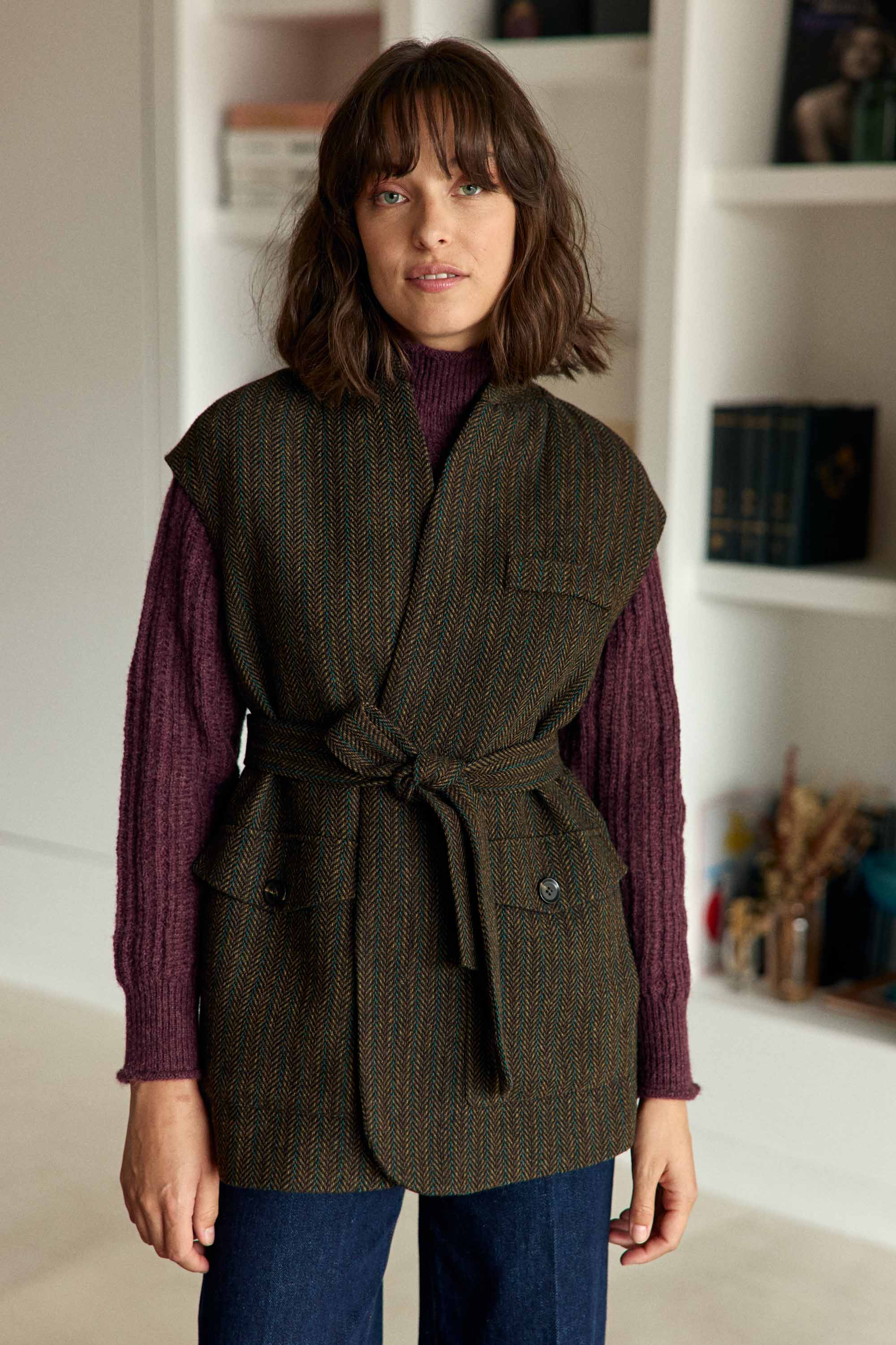 Velia. la veste sans manches à tissage chevron. avec col châle. poches plaquées à rabat et ceinture amovible.