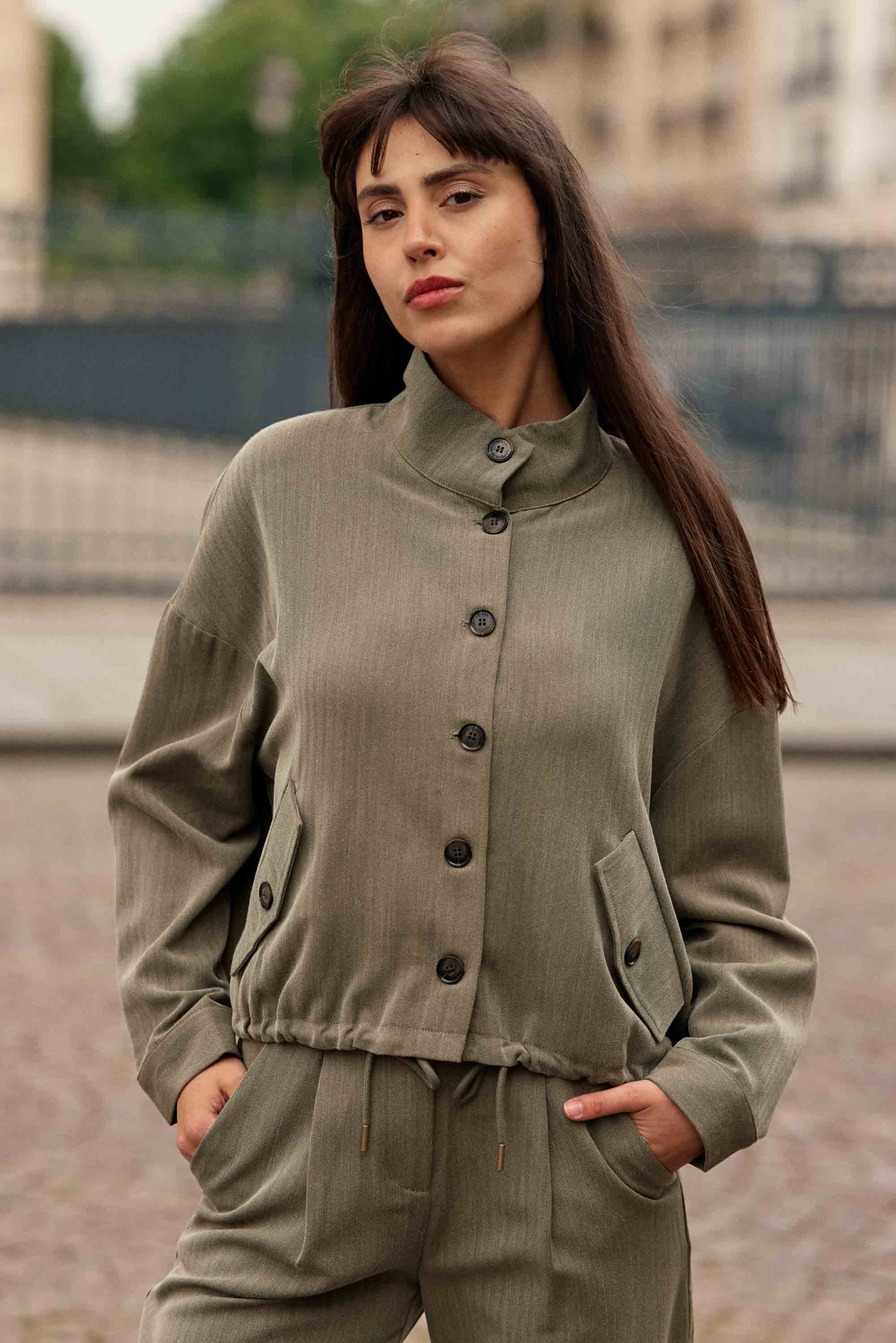Vely. la veste oversize kaki à tissage chevron. avec col montant large. manches longues et poches à rabat.